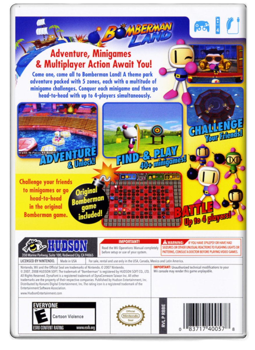 Come one, come all to Bomberman Land! A theme park adventure packed with 5 zones, each with a multitude of minigame challenges. Conquer each minigame and then go head-to-head with up to 4-players simultaneously.