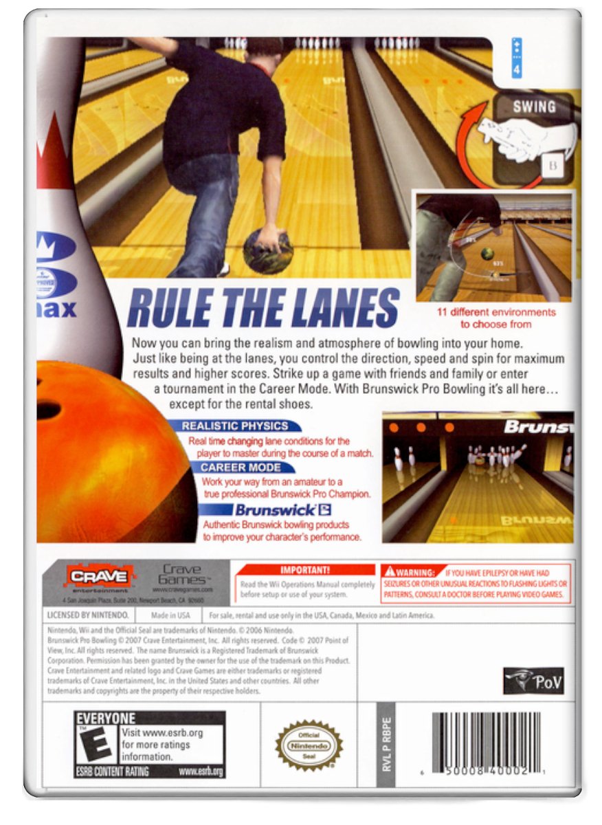 Now you can bring the realism and atmosphere of bowling into your home. Just like being at the lanes, you control the direction, speed and spin for maximum results and higher scores. Strike up a game with friends and family or enter a tournament in the career mode. With Brunswick Pro Bowling it's all here... except for the rental shoes.