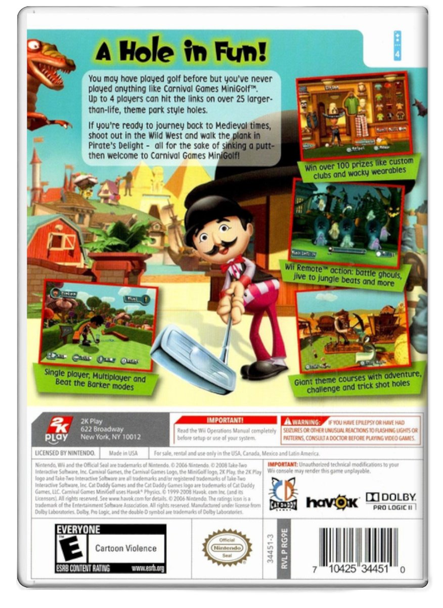 You may have played golf before but you've never played anything like Carnival Games MiniGolf. Up to 4 players can hit the links on over 25 larger-than-life, theme park style holes.
