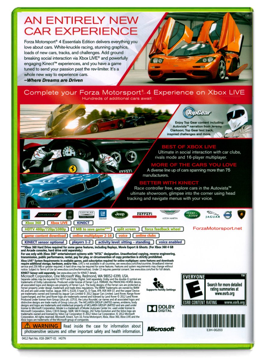 Forza Motorsport 4 Essentials Edition delivers everything you love about cars. White-knuckle racing, stunning graphics, loads of new cars, tracks, and challenges. Add ground breaking social interaction via Xbox LIVE and powerfully engaging Kinect experiences, and you have a game tuned to send your passion past the rev-limiter. It's a whole new way to experience cars.- Where Dreams are Drive