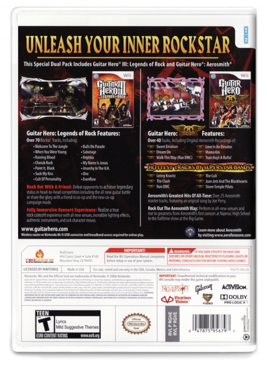 This special dual pack includes Guitar Hero III: Legends of Rock and Guitar hero: Aerosmith.