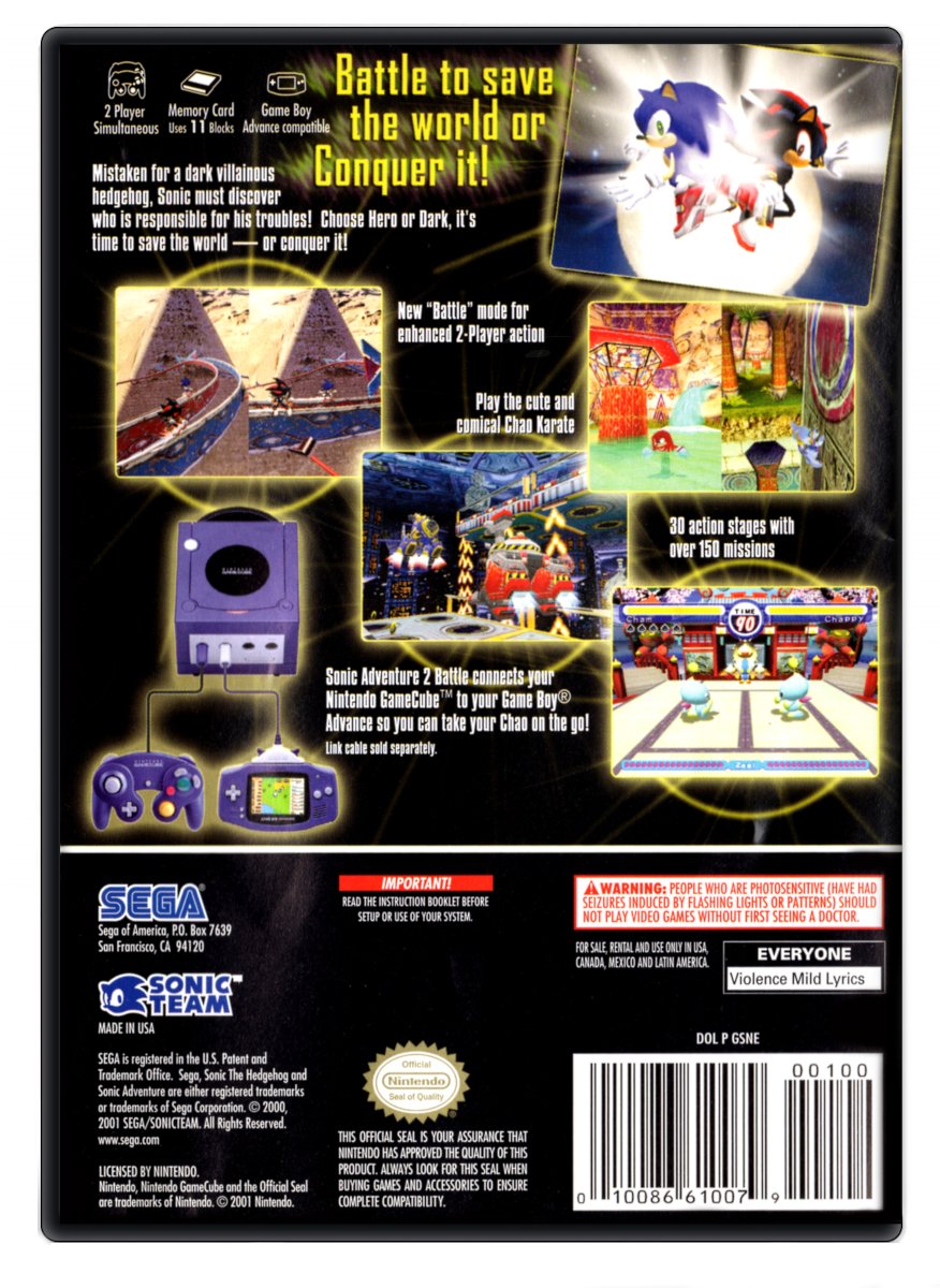 - Sonic Adventure 2 Battle connects to your Nintendo Gamecube to your Game Boy Advance so you can take your Chao on the go!