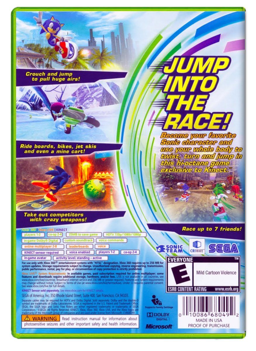 Become your favorite Sonic character and use your whole body to twist, turn and jump in this hi-octane game exclusive to Kinect.- Crouch and jump to pull huge airs!